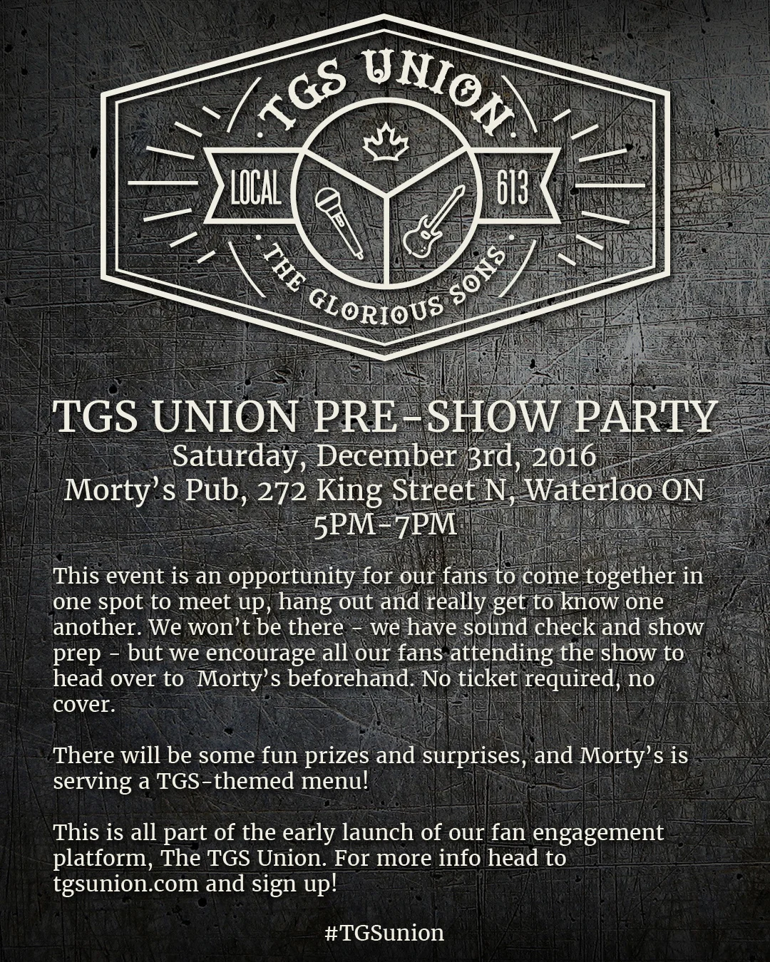 As a kick-off, TGS Union is presenting a pre-show party at Morty's Pub in Waterloo this Saturday, December 3rd from 5PM-7PM. We won't be able to attend personally, but it'll be a great opportunity for our fans to meet and hang out before the show. Morty's is serving a TGS-themed menu, and there will be some prizes and surprises in store. We're hoping to organize similar pre-show parties at as many of our shows as possible. Being a member of the TGS Union will ensure you get that info first.